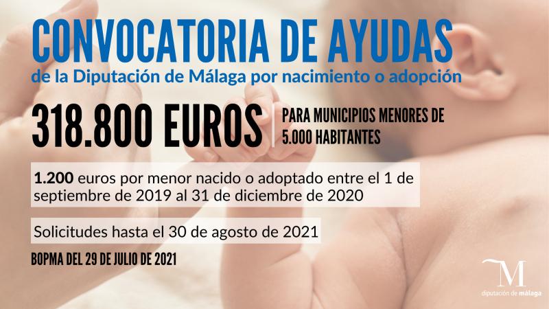 La Diputación de Málaga abre mañana el plazo para solicitar ayudas por nacimiento o adopción para familias que residan en los municipios menores de 5.000 habitantes, conocido con el ‘cheque bebé’. Esta línea de subvenciones, cuya convocatoria se publica hoy en el Boletín Oficial de la Provincia de Málaga, cuenta con una dotación global de 318.800 euros y podrán beneficiarse unas 260 familias de esas localidades. La cuantía que se concederá será de 1.200 euros por menor nacido o adoptado entre el 1 de septiembre de 2019 y el 31 de diciembre de 2020.