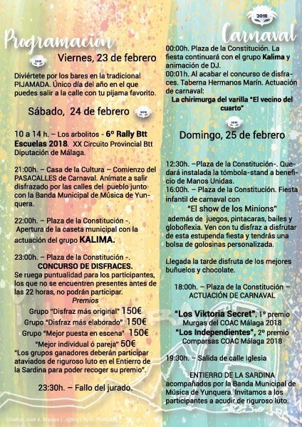 Este año además de la fiesta de pijamas, fiesta infantil, concurso de disfraces y entierro de la sardina, estará con nosotros algunos de los primeros premios del concurso de las tablas del Teatro Cervantes.La murga de Felix Godoy, primer premio en la categoría de murgas del Carnaval de Málaga, unos alemanes de Cervezas Victoria que visitarán yunquera para cantar un repertorio muy trabajado.