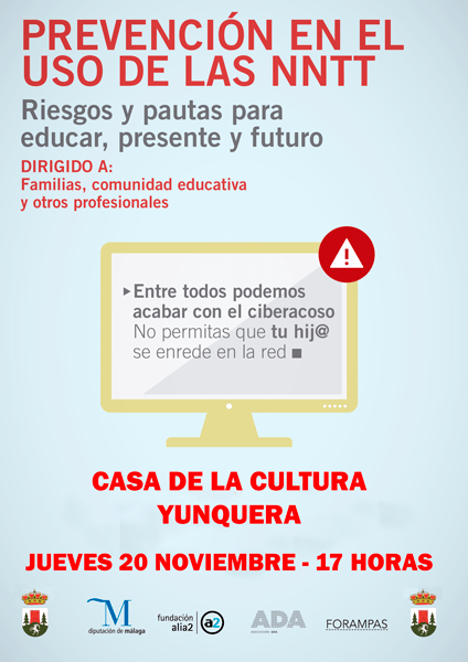 La charla tendrá lugar en la casa de la cultura de Yunquera el próximo jueves 20 de noviembre a las 17 horas, con la colaboración de fundación Aliados, la asociación Ada y Forampas. No faltes a la cita e infórmate sobre cómo prevenir el ciberacoso. Te esperamos.