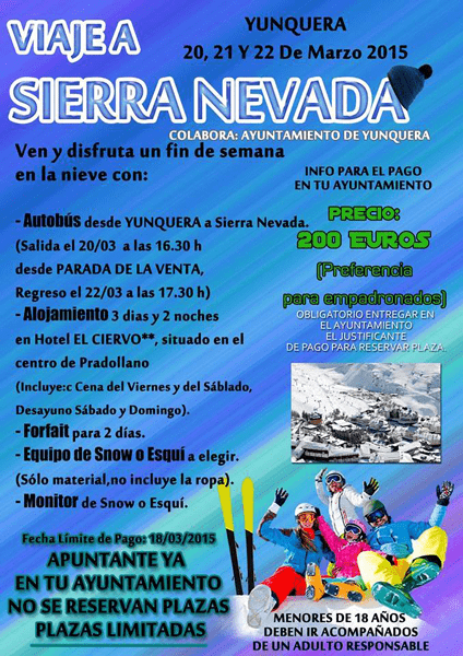 ¿Quieres disfrutar de un fin de semana inolvidable esquiando o haciendo snowboard en Sierra Nevada? ¡Apúntate ya en el ayuntamiento! No importa si tienes experiencia o no. El 20, 21 y 22 de marzo ven con nosotros a Sierra Nevada.