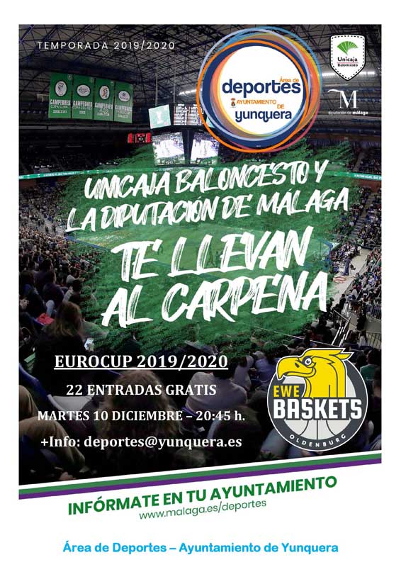 El Ayuntamiento de Yunquera en colaboración con la Diputación Provincial de Málaga y Unicaja baloncesto, pone a disposición 22 entradas gratuitas entre los vecinos del municipio que estén interesados en asistir al encuentro de Eurocup entre Unicaja y Ewe Baskets (Alemania).
