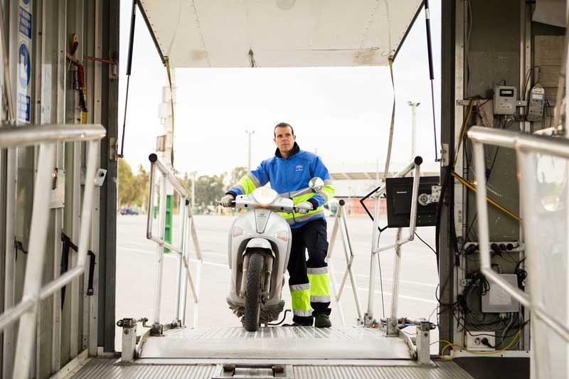 En la actualidad, VEIASA gestiona 8 Unidades Móviles de ITV para Ciclomotores. Gracias a estas unidades, las personas usuarias no tienen que desplazarse más de 15 Km. para pasar la ITV de su ciclomotor, lo que además de acercar el servicio a la ciudadanía, resulta muy positivo para el medio ambiente, ya que dejan de emitirse toneladas de CO2 a la atmósfera en desplazamientos.
