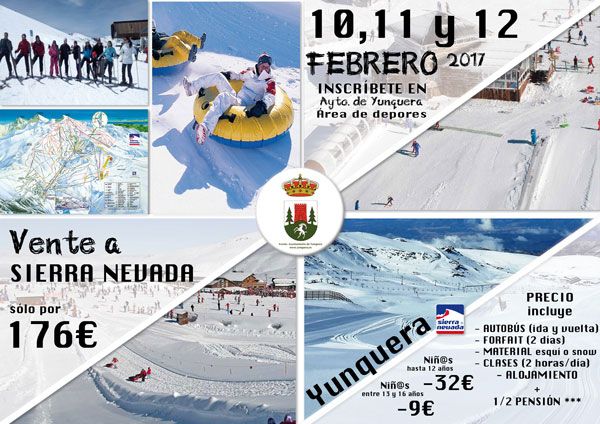 Tras el éxito de esta actividad llevada años atrás, el Ayuntamiento de Yunquera pone en marcha todo lo necesario para que los días 10, 11 y 12 de febrero de 2017 nuestros vecinos puedan disfrutar de nuevo de los deportes de invierno en las modalidades de esquí y snow.