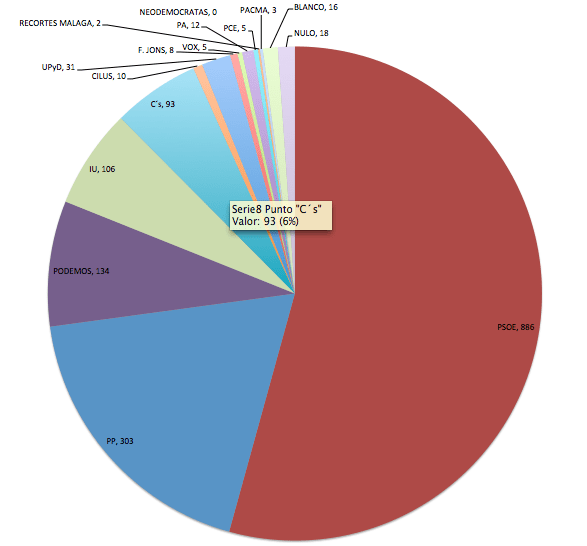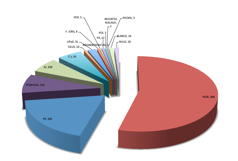 VOX 5  –  PA 12 –  PCE 5  – RECORTES MALAGA 2  –  PACMA 3  –  BLANCOS 16  –  NULO 18