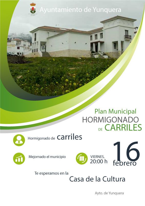 El ayuntamiento convoca a todos los vecinos interesados en el arreglo y hormigonado de carriles públicos a una reunión informativa que tendrá lugar el próximo viernes 16 de febrero a las 20:00 horas en la casa de la Cultura de Yunquera. En dicha reunión, se dará a conocer el Plan Municipal de arreglo de Caminos vecinales para 2018 y se resolverán todas las dudas que puedan surgir.