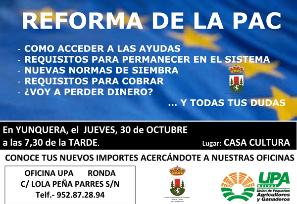 UPA Málaga junto al Excmo. Ayuntamiento de Yunquera convoca al pueblo de Yunquera a una reunión donde se hablará de la última reforma de la Política Agraria Común (PAC) y explicará a nuestros vecinos/as como acceder a la ayudas, además se hablará sobre las nuevas normas de siembra entre otros aspectos interesantes para los distintos colectivos agrarios y ganaderos.