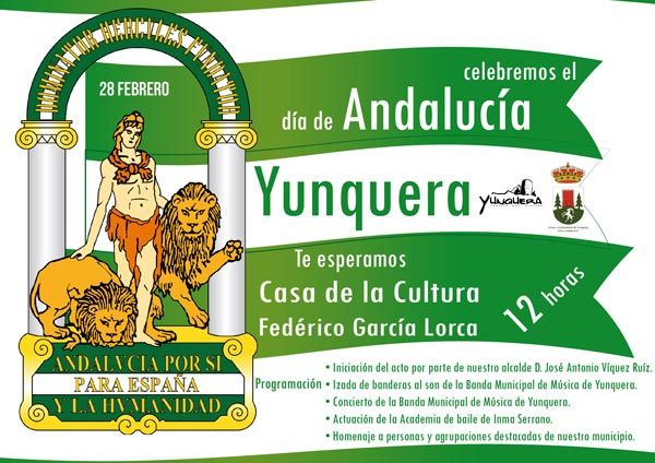 Este año todos los yunqueranos/as junto con el equipo de gobierno y autoridades celebramos el martes 28 de Febrero a partir de las 12 horas en la Casa de la Cultura Federico García Lorca el día de Andalucía.